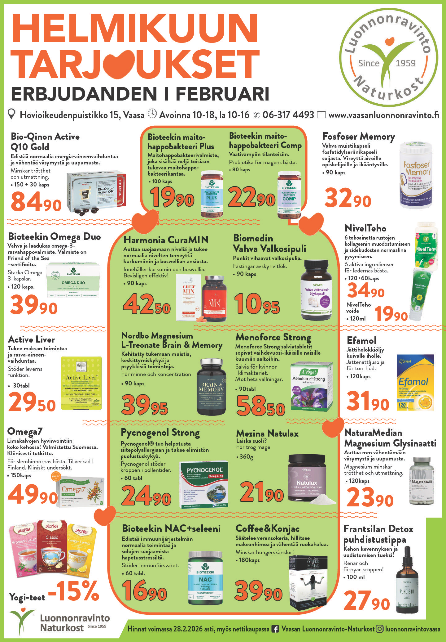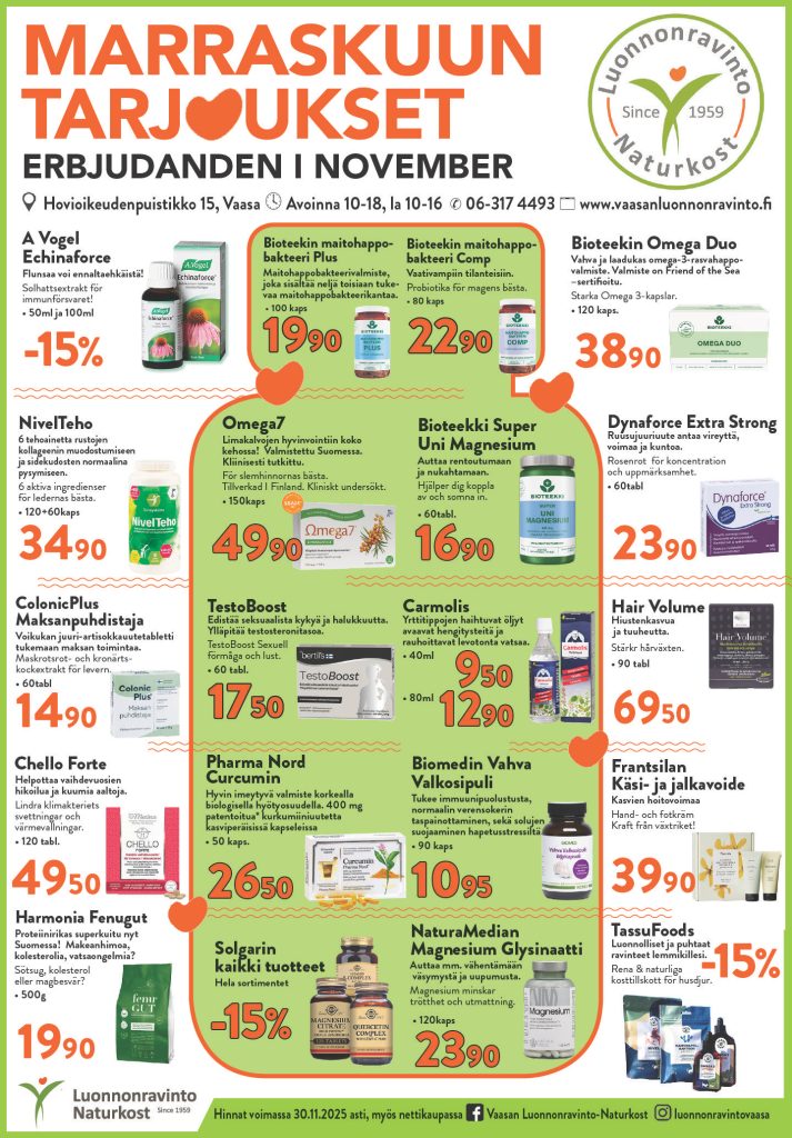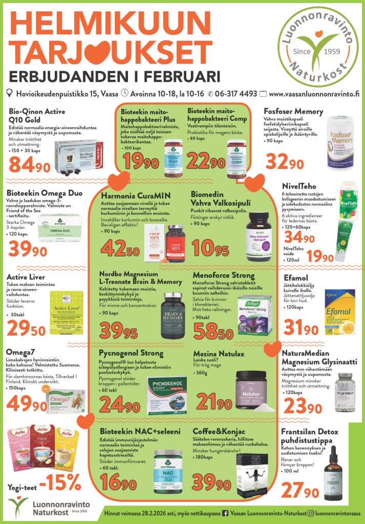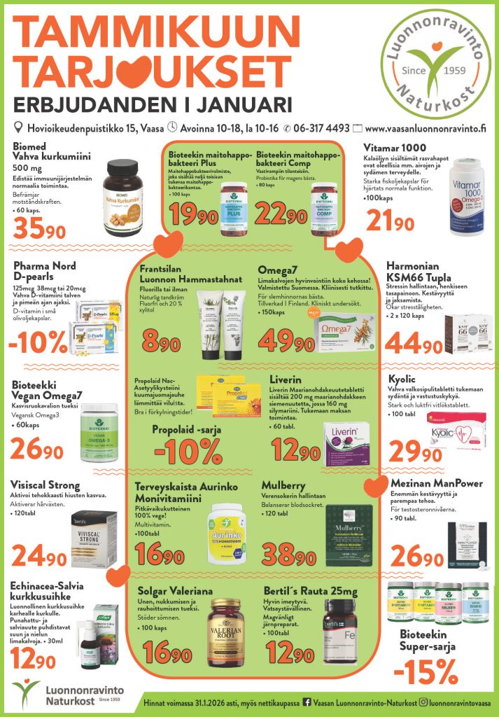 Tervetuloa tutustumaan liikkeeseen! Meillä on suuri valikoima ravintolisiä, luontaiskosmetiikkaa, elintarvikkeita, homeopaattisiä lääkkeitä, superfoodeja, urheiluravinteita, yms ja palvelemme ilomielin! Asiantunteva kauppias, fytonomit ja luontaistuotemyyjät auttavat sinua löytämään parhaat ratkaisut parempaan elämään.