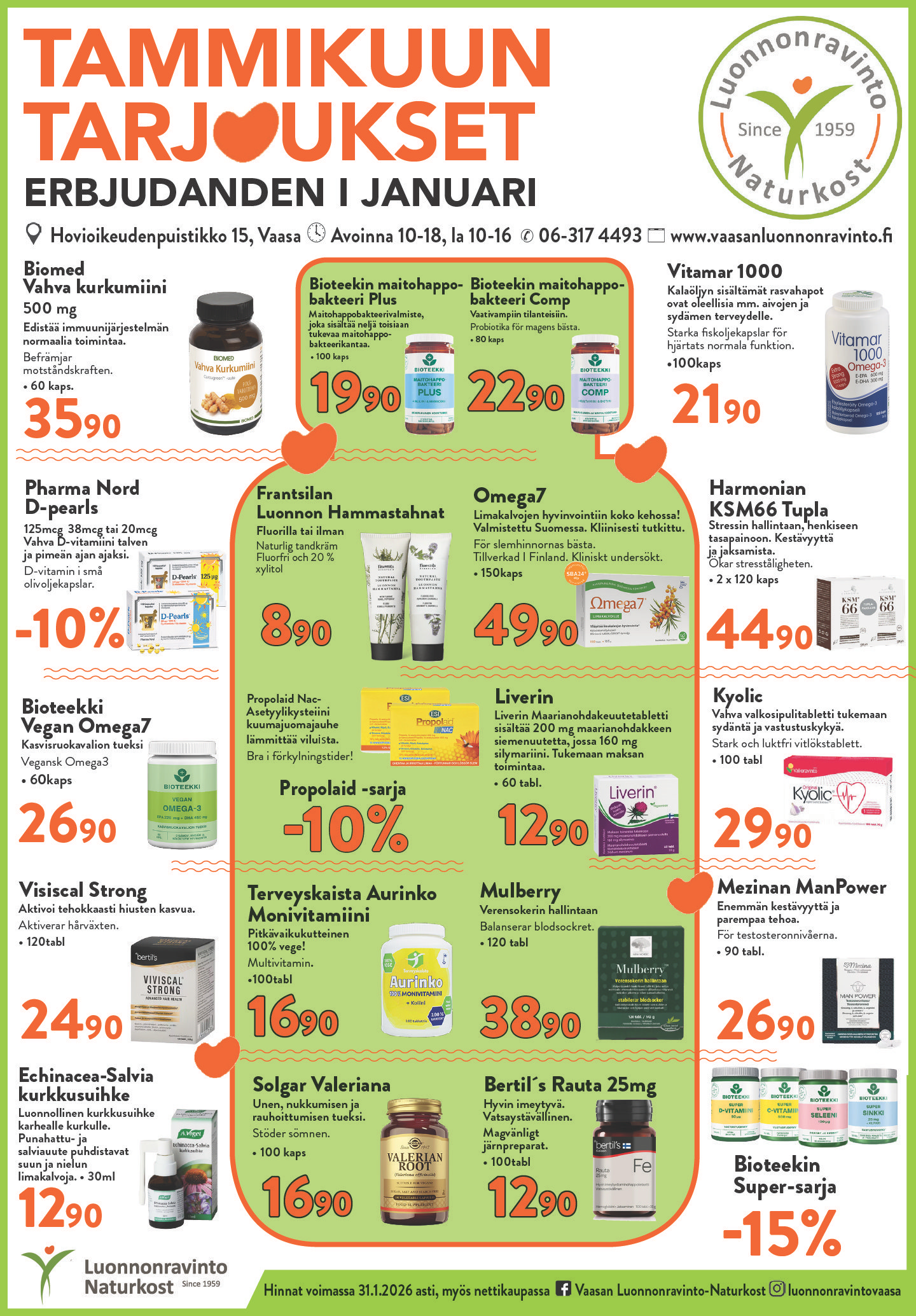 Meillä on iso myymälä Vaasan keskustassa. Kivijalkamyymälämme sijaitsee Hovioikeudenpuistikolla aivan torin varrella Hartmanin talossa. Vaasan Luonnonravinto on auki arkisin 10-18, lauantaisin 10-16.